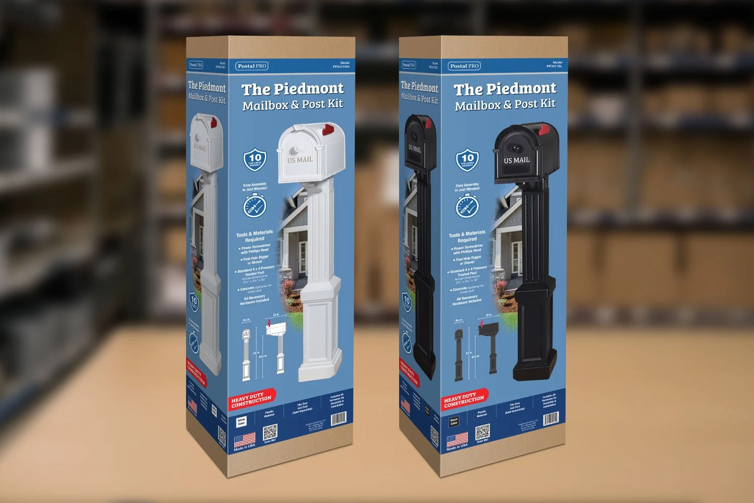 We also designed packaging for Postal Pro’s full line of mailboxes and post kits. Clean, structured layouts emphasize durability, while bold graphics and lifestyle imagery reinforce curb appeal, quality, and ease of installation. Clear icons and callouts highlight key benefits such as Heavy Duty Construction and a 10-Year Limited Warranty, giving shoppers instant clarity at retail.